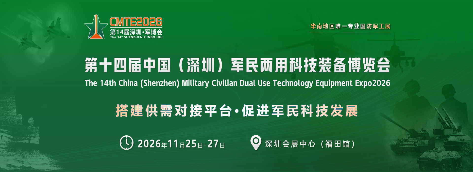 为贯彻落实党中央提出的“坚持科学发展观,提高自主创新能力”的指示精神,促进军民融合加快国防和军队现代化发展。在国家相关部委及主管部门的大力支持下,由中国和平利用军工技术协会、全国工商联科技装备业商会、深圳国防科技工业协会主办,麒麟软件有限公司、贵州航天电器股份有限公司赞助,中国电子科技集团、中国航天科技集团、中国航天科工集团、中国航空工业集团、中国船舶集团、中国航空发动机集团、中国电子信息产业集团协办,由深圳企发展览有限公司承办的“第十四届中国(深圳)军民两用科技装备博览会(简称“深圳·军博会”)”将于2026年11月25日-27日在中国.深圳会展中心(福田)隆重举办。